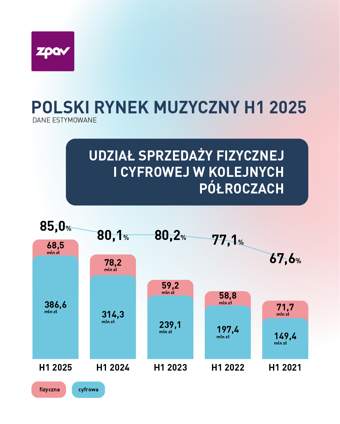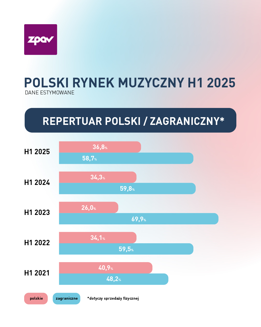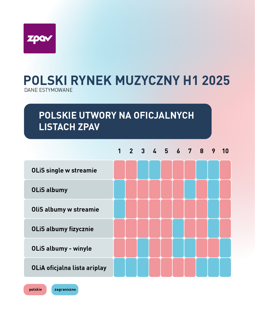 To, co szczególnie cieszy, to rosnąca popularność polskich artystów. Widać to nie tylko w sprzedaży nośników fizycznych, gdzie rodzimy repertuar umacnia swoją pozycję, ale także w streamingu, który w którym siedem z dziesięciu najpopularniejszych albumów w streamingu to wydawnictwa polskich wykonawców. Widać też, że winyle, które z roku na rok mają coraz więcej miłośników, stają się segmentem, gdzie polska muzyka cieszy się wyjątkową lojalnością słuchaczy. Choć w radiu wciąż dominują zagraniczne nagrania, to jestem przekonana, że sukcesy na rynku sprzedaży będą się przekładać także na rosnącą obecność polskich utworów także w eterze. Zwiastuje to kolejny rok wzrostu liczby polskich utworów w top 100 zestawienia Airplay ZPAV-u za pierwsze półrocze 2025 r. Dla słuchaczy to jasny sygnał – polska muzyka jest dziś silna, różnorodna i warta uwagi – mówi Anna Ceynowa, Dyrektorka Komunikacji ZPAV.