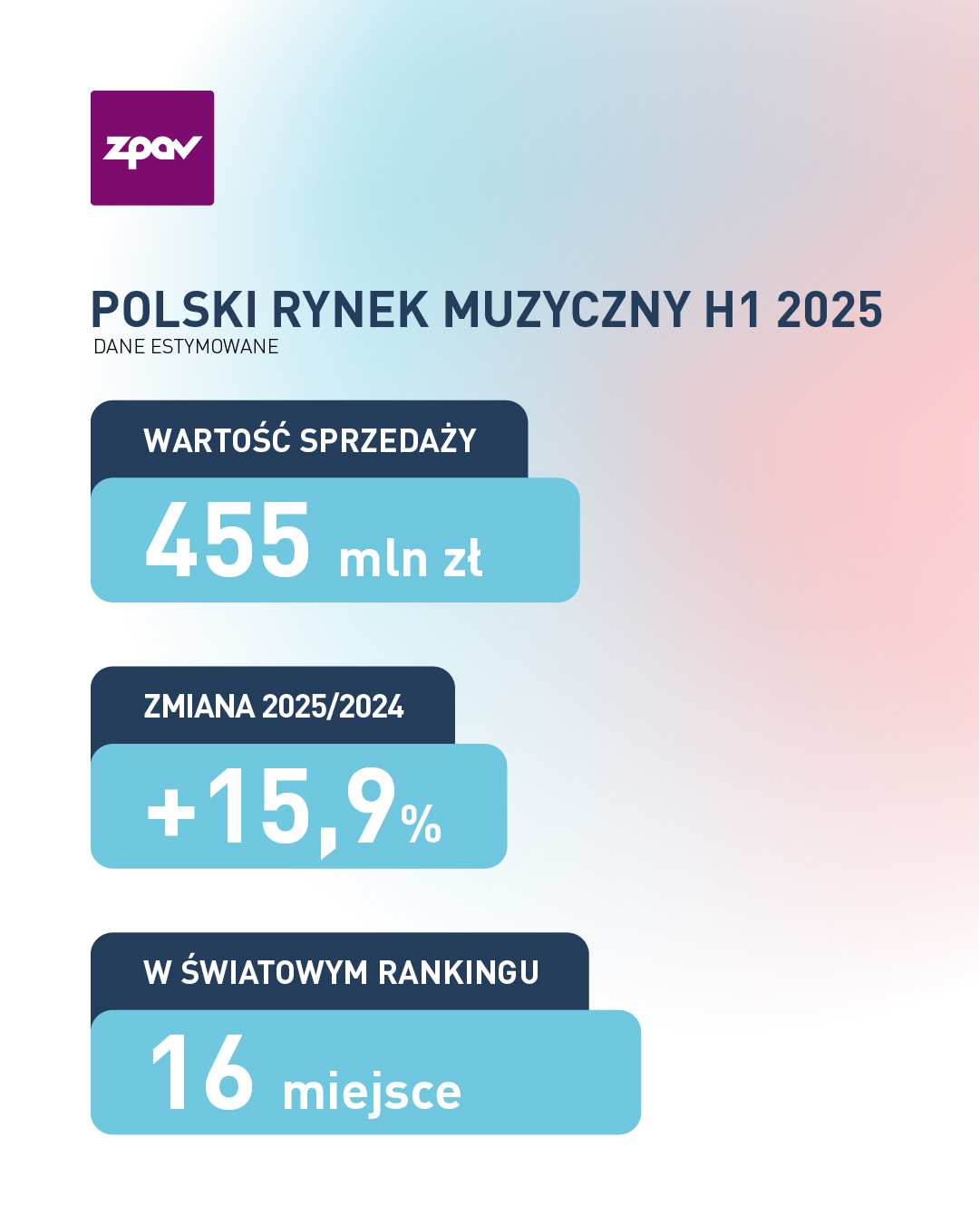 Awans Polski na 16. miejsce w światowym rankingu IFPI to wydarzenie, które można nazwać historycznym. Jeszcze kilka lat temu nasz rynek był postrzegany jako średni w skali europejskiej, a dziś stajemy się jednym z liderów regionu i konsekwentnie doganiamy światową czołówkę piętnastu największych rynków muzycznych. Wzrost o blisko 16% w pierwszym półroczu 2025 roku pokazuje, że branża muzyczna w Polsce ma stabilne fundamenty i rośnie w sposób zrównoważony. To niezwykle ważne, bo realnie przyciąga uwagę globalnych firm, serwisów streamingowych czy inwestorów. Bardzo się cieszę, że podczas drugiej edycji wydarzenia „Muzyka, Biznes, Technologia. Konferencja Fryderyk Festiwal 2025”, które dziś rusza, jako ZPAV możemy podzielić się tak dobrymi wskaźnikami polskiego rynku muzycznego. Jestem przekonany, że przed nami kolejne dobre lata, a rok 2025 zakończymy także awansem, jeśli nie o dwie pozycje, jak w zestawieniu półrocznym, to co najmniej o jedną – komentuje Bogusław Pluta, Dyrektor Zarządzający ZPAV.