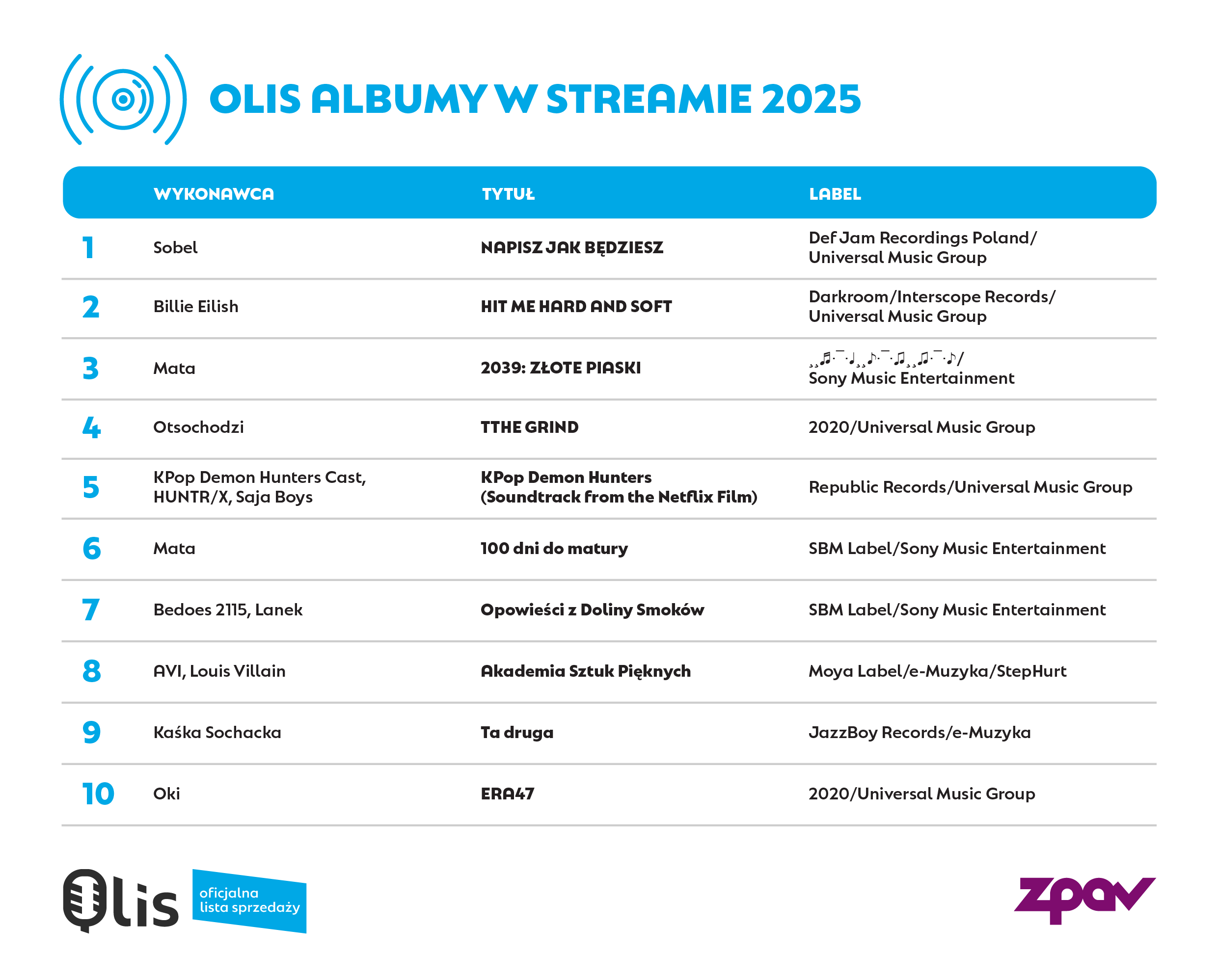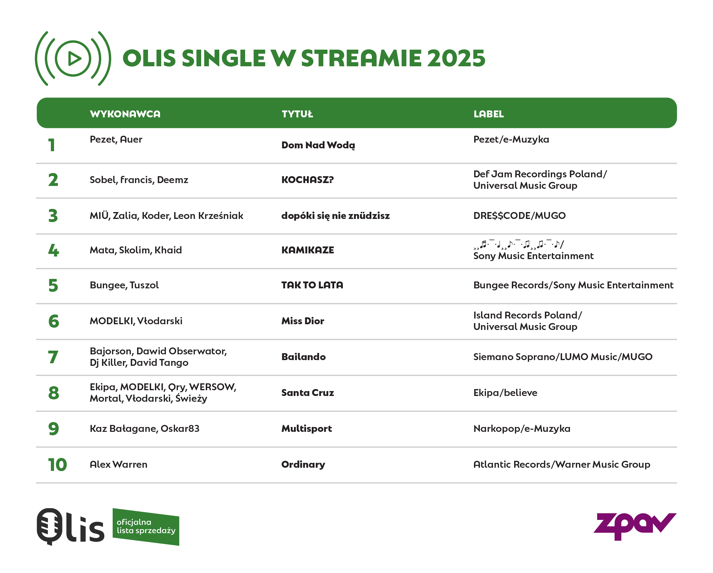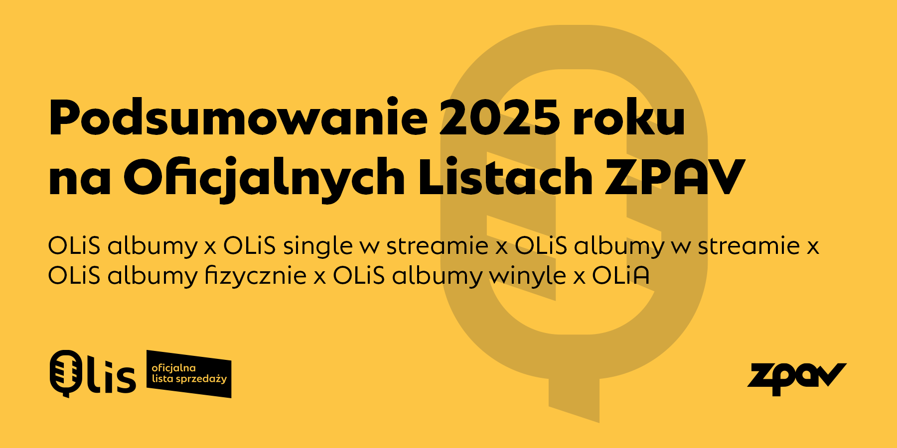 Podsumowując 2025 rok na Oficjalnych Listach Sprzedaży, Związek Producentów Audio Video potwierdza utrzymującą się dominację polskich artystów na rynku muzycznym. Rodzimy repertuar umacnia swoją pozycję przede wszystkim w streamingu oraz sprzedaży albumów, podczas gdy radiowy Airplay pozostaje segmentem zdominowanym przez zagraniczne produkcje. Najpopularniejszym singlem roku w streamingu został Dom nad wodą Pezeta i Auera, na czele zestawienia OLiS Albumy w Streamie znalazł się Sobel z albumem Napisz jak będziesz, natomiast sprzedaż fizyczną oraz listę łączącą sprzedaż cyfrową i fizyczną, tj. OLiS Albumy, otwiera Quebonafide z wydawnictwem Północ / Południe. Z kolei w radiu najczęściej granym utworem 2025 roku było Ordinary Alexa Warrena.