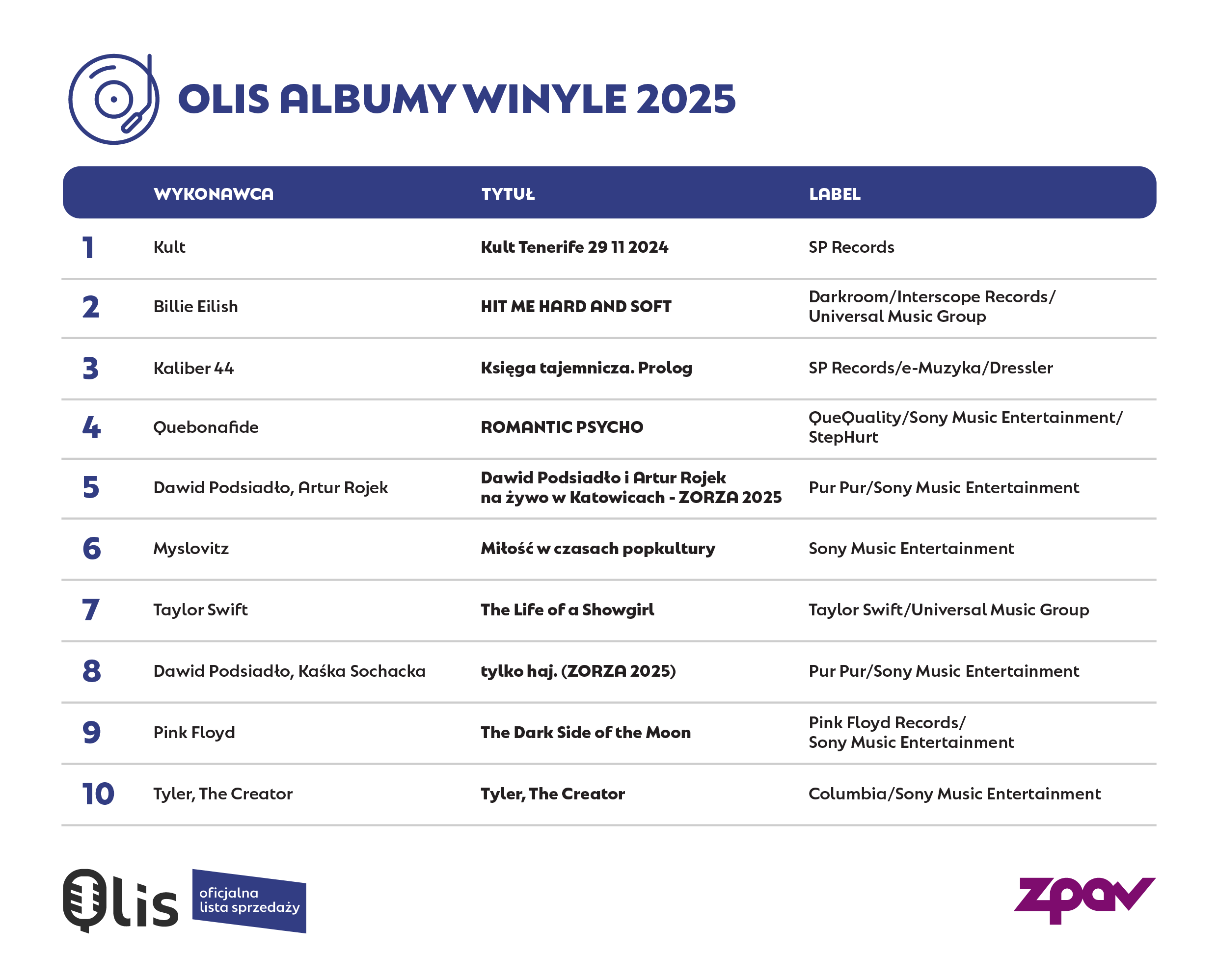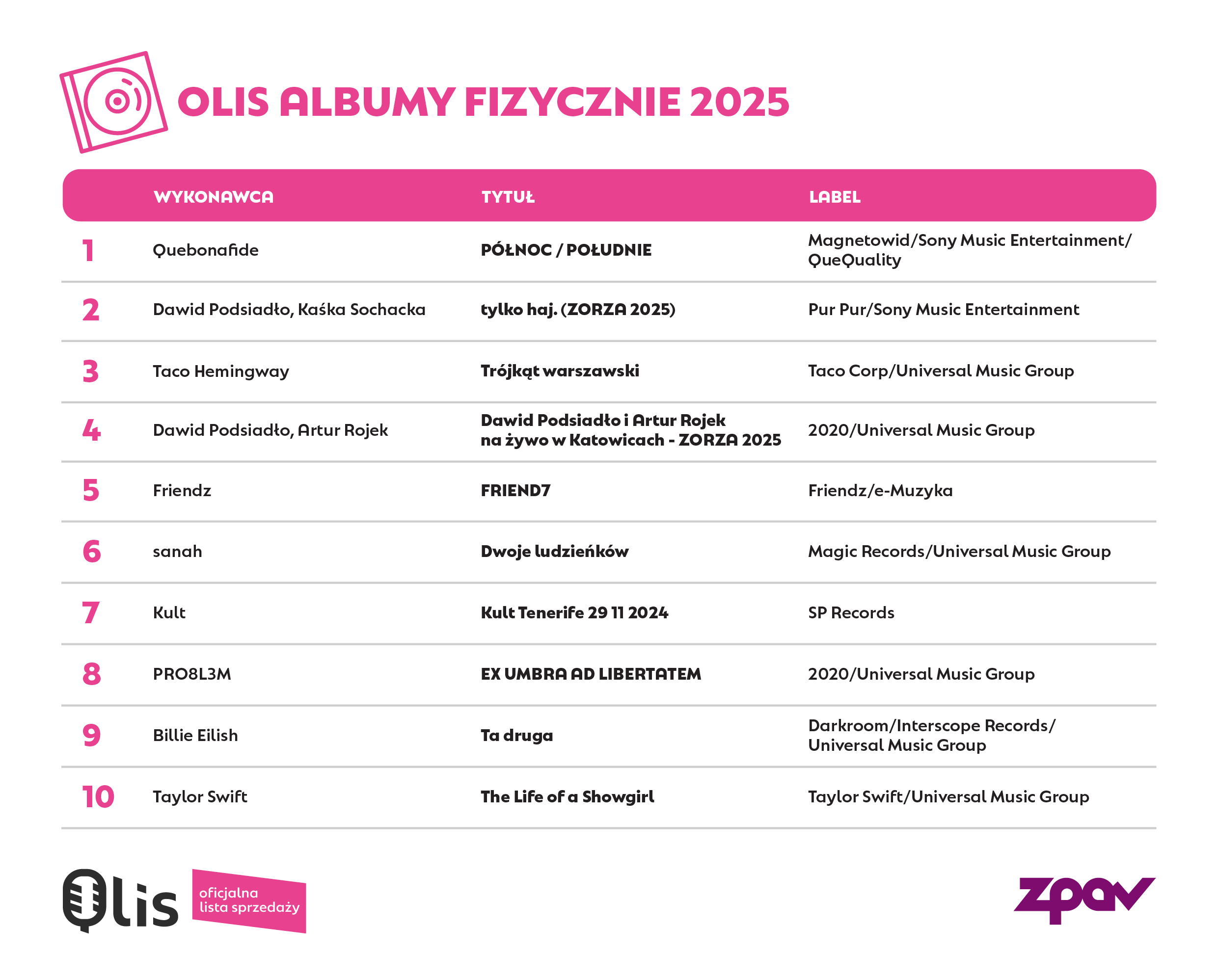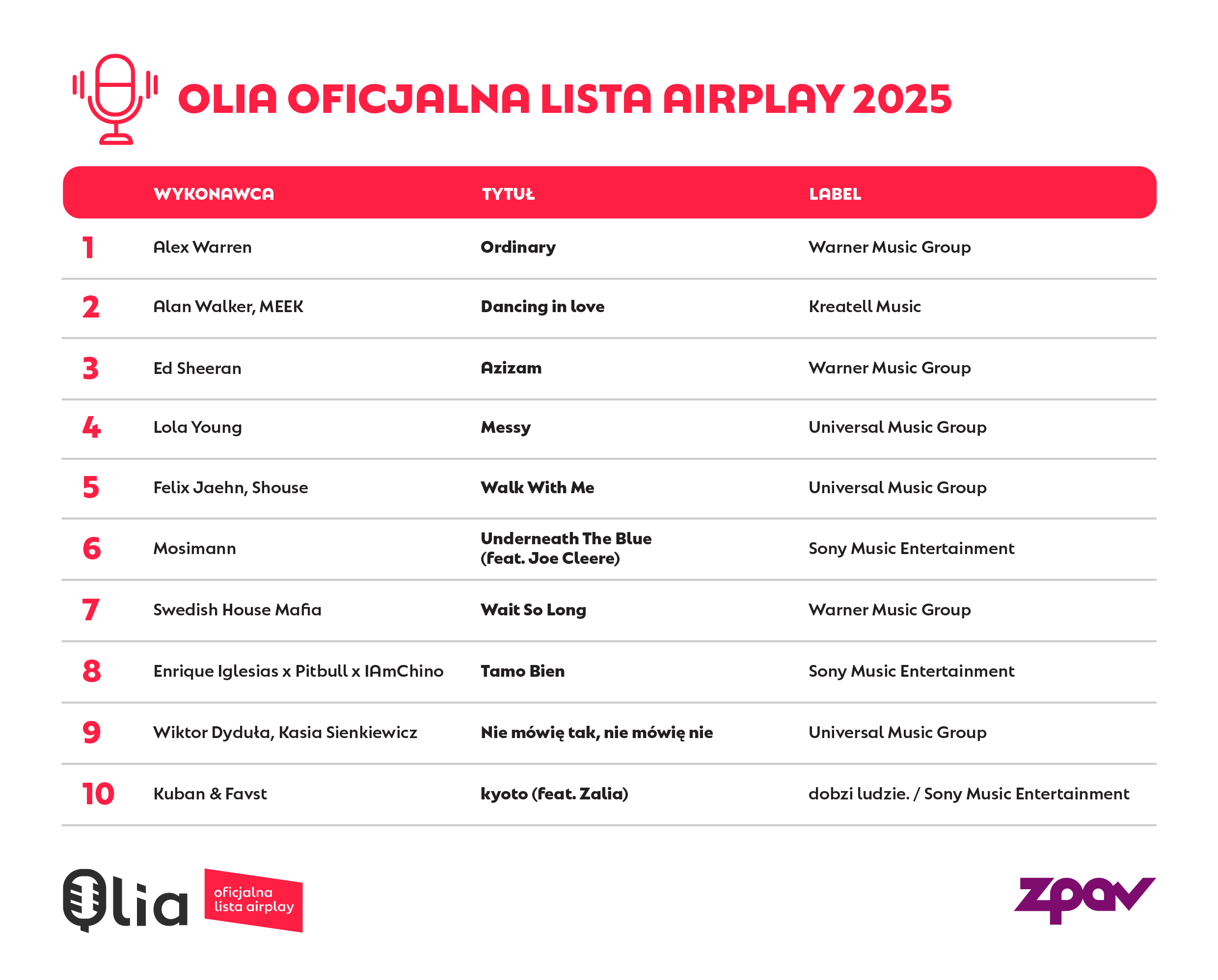 Podsumowując 2025 rok na Oficjalnych Listach Sprzedaży, Związek Producentów Audio Video potwierdza utrzymującą się dominację polskich artystów na rynku muzycznym. Rodzimy repertuar umacnia swoją pozycję przede wszystkim w streamingu oraz sprzedaży albumów, podczas gdy radiowy Airplay pozostaje segmentem zdominowanym przez zagraniczne produkcje. Najpopularniejszym singlem roku w streamingu został Dom nad wodą Pezeta i Auera, na czele zestawienia OLiS Albumy w Streamie znalazł się Sobel z albumem Napisz jak będziesz, natomiast sprzedaż fizyczną oraz listę łączącą sprzedaż cyfrową i fizyczną, tj. OLiS Albumy, otwiera Quebonafide z wydawnictwem Północ / Południe. Z kolei w radiu najczęściej granym utworem 2025 roku było Ordinary Alexa Warrena.